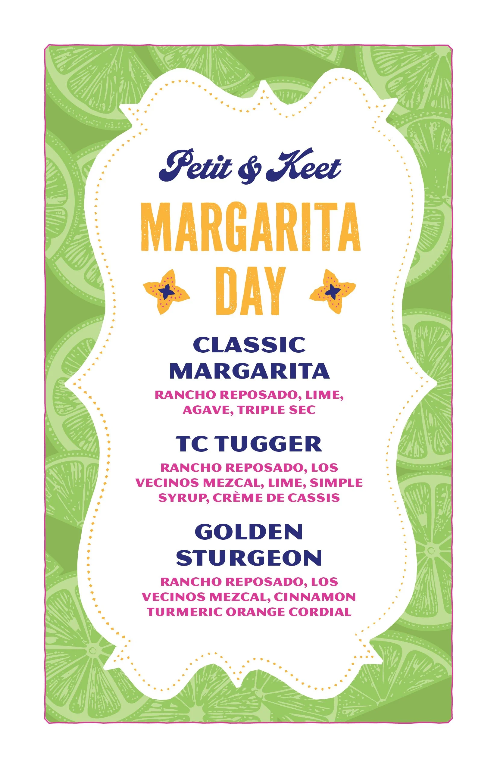 Join us at Petit & Keet on Sunday, February 22nd, 4-9 PM, to celebrate National Margarita Day! Check out our margaritas for the occasion below. ⬇️ See you there!